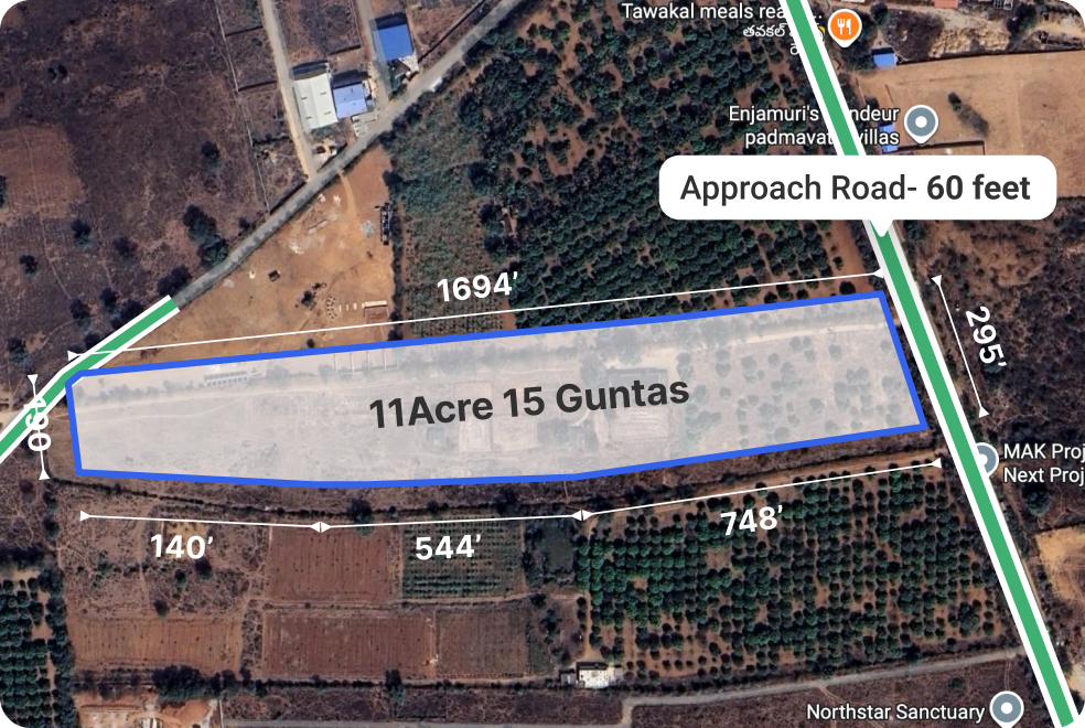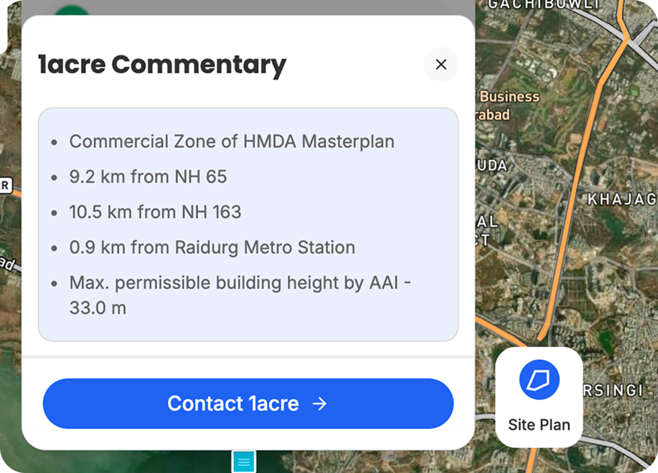 1acre provides more geospatial intelligence for each Land listed, apart from the details shared by the seller. Processing the data we have and by fetching from various other public and paid sources, we gather more information about the Land and present it to the buyers. Below is a sample for a Land: •7.7 km from SH 4 •6.7 km from NH 163 •2.9 km from Khajaguda Metro Station (Upcoming) •Max. permissible building height by AAI - 134.0 m